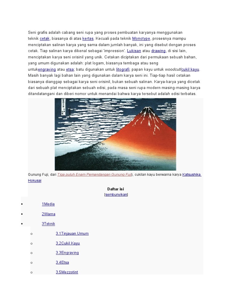 Seni Grafis Adalah. Pengertian seni grafis adalah salah satu karya seni rupa murni berwujud dua dimensi yang proses pembuatannya melalui teknik cetak. Tiap salinan karya dikenal sebagai 'impression'.